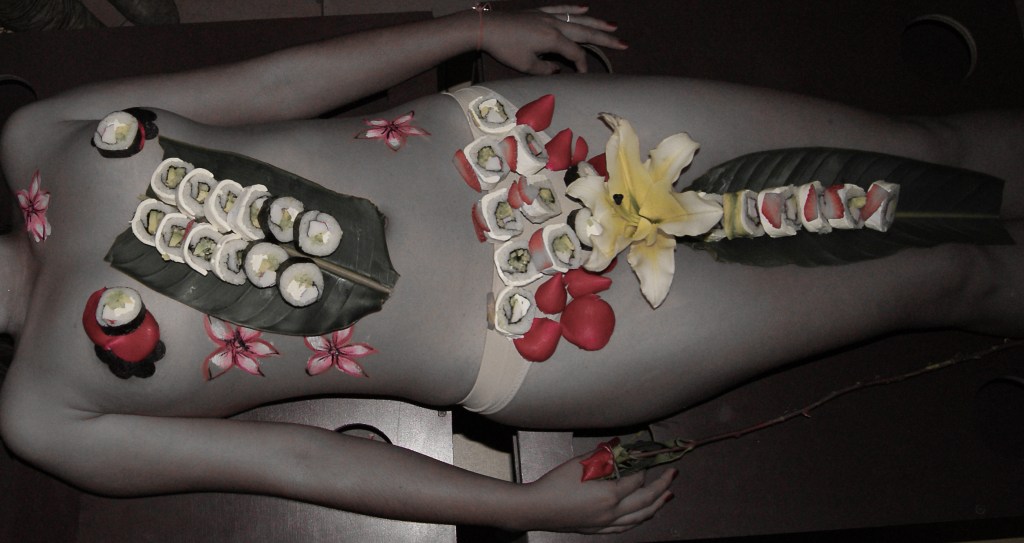 Something that Sir introduced me to on Monday was nyotaimori, or “body sushi”. It’s a new idea for me (at least to be exposed to in kink), but it’s not something I’m against. It’s new, interesting. Fun?